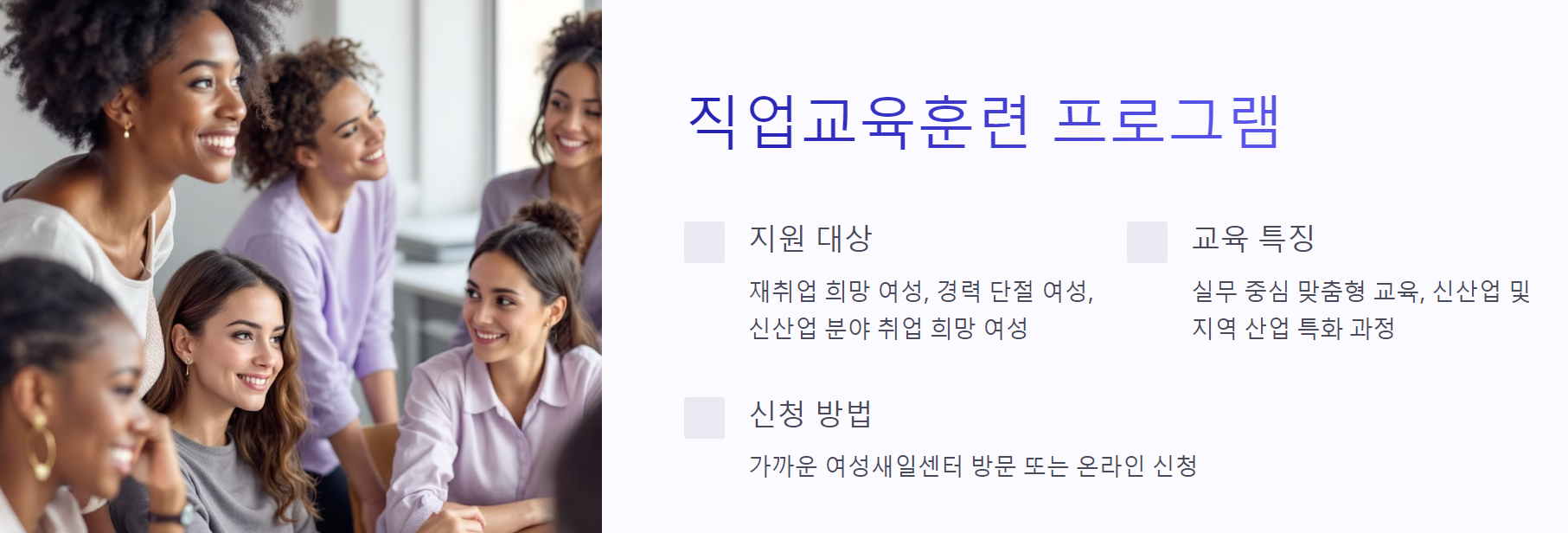 - 지원 대상: 재취업을 희망하는 여성, 경력 단절 여성, 신산업 분야 취업 희망 여성 등