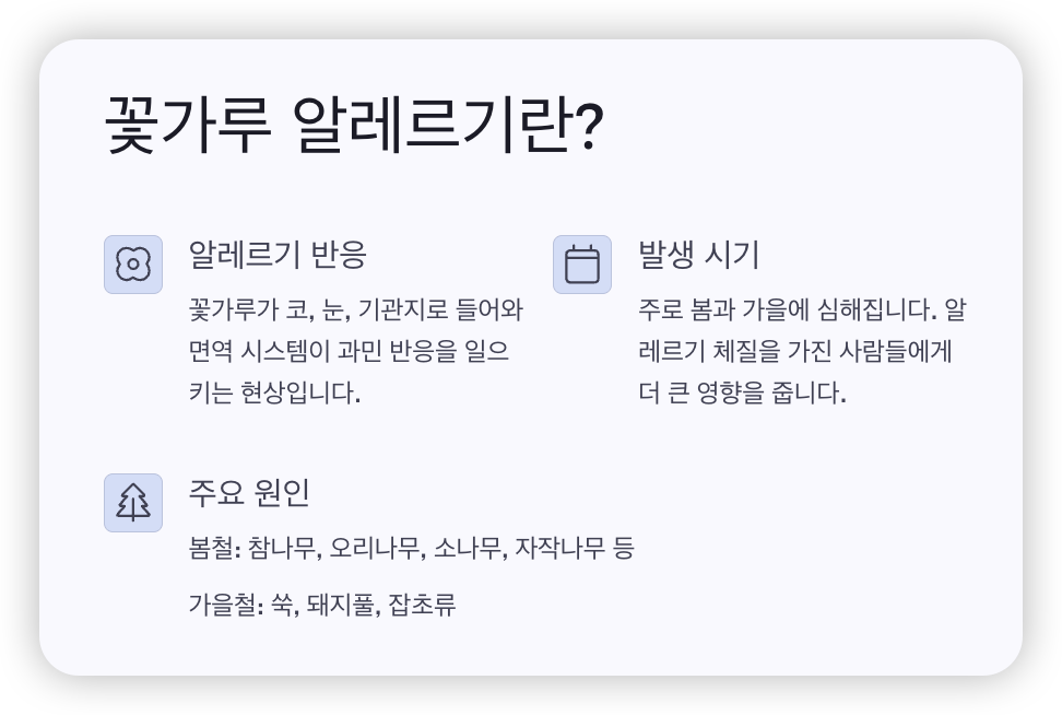 꽃가루 알레르기는 꽃가루가 코, 눈, 기관지 등으로 들어와 면역 시스템이 과민 반응을 일으키는 현상을 말합니다.