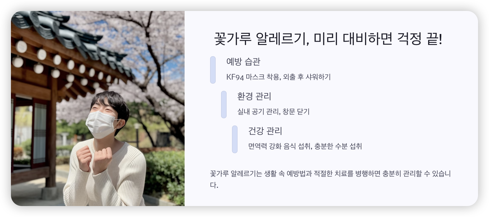 꽃가루 알레르기는 생활 속 예방법과 적절한 치료를 병행하면 충분히 관리할 수 있습니다.