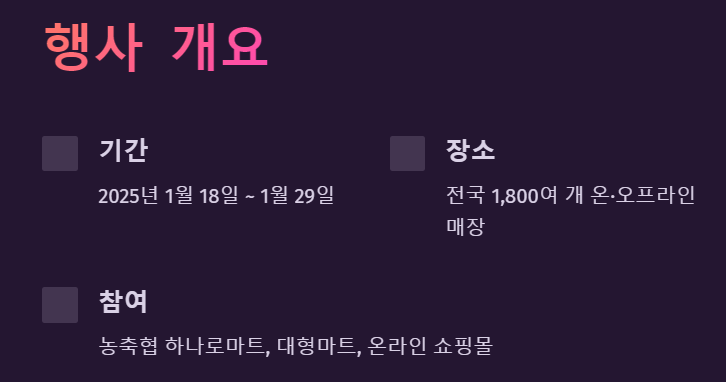 1) 행사 기간: 2025년 1월 18일(목) ~ 1월 29일(월) (12일간 진행)