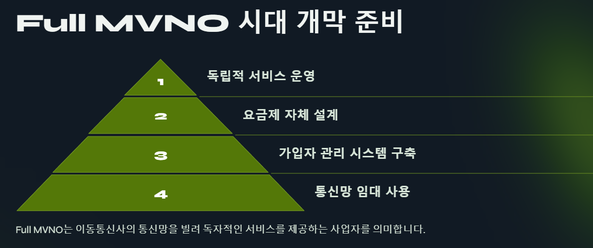 1) Full MVNO란? 이동통신사의 통신망을 빌려 서비스를 제공하지만, 요금제 설계, 가입자 관리 시스템 등을 독자적으로 구축하여 운영하는 사업자를 의미합니다.