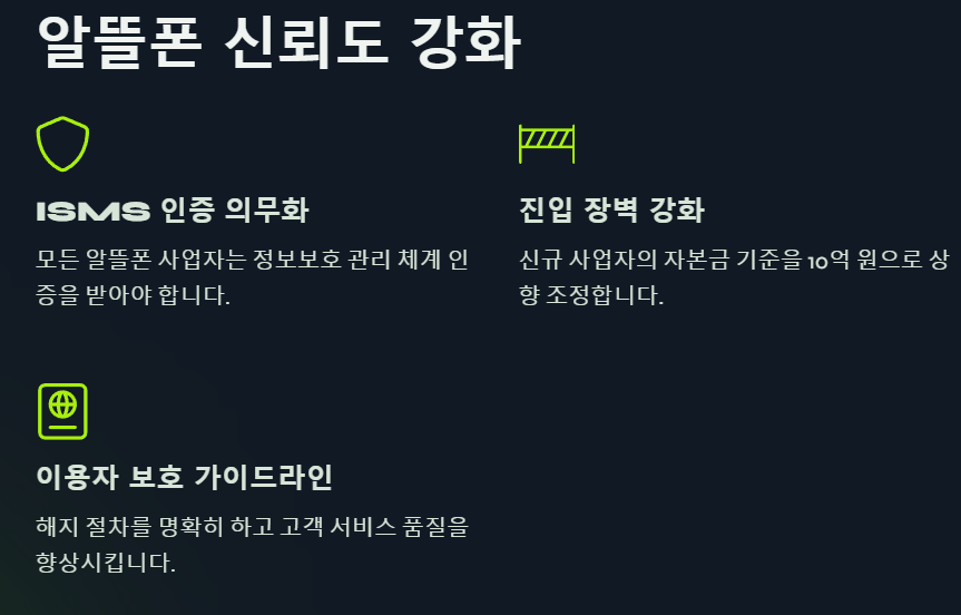 - ISMS 인증 의무화: 모든 알뜰폰 사업자는 정보보호 관리 체계(ISMS) 인증을 의무적으로 받아야 하며, 정기적인 사후 심사를 통해 정보 보호 역량을 점검받게 됩니다.