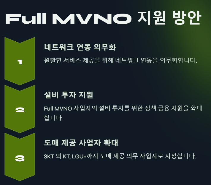 - 설비 투자 지원: Full MVNO 사업자의 설비 투자를 위한 정책 금융 지원을 확대합니다.