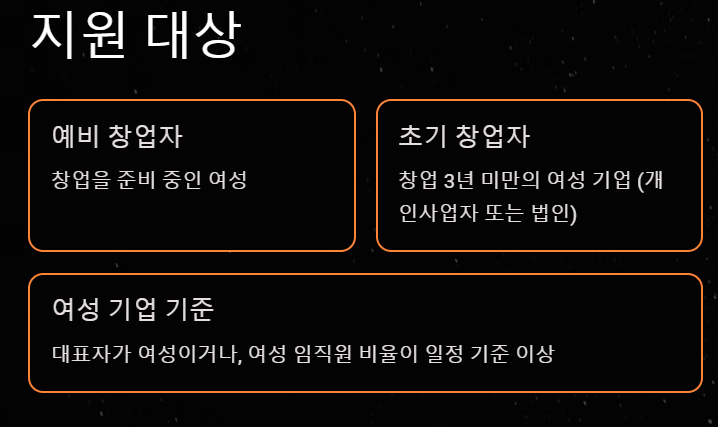 - 창업 3년 미만의 여성 기업: 사업자등록증 기준 창업 3년 미만의 여성 기업 (개인사업자 또는 법인)