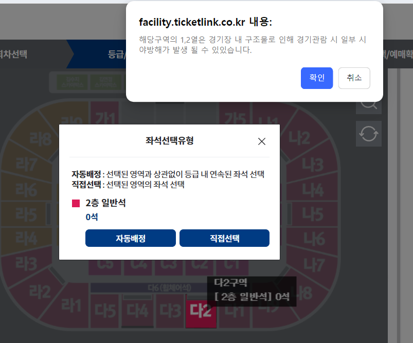 예매는 자리를 자동배정, 직접선택 2가지의 선택있는데