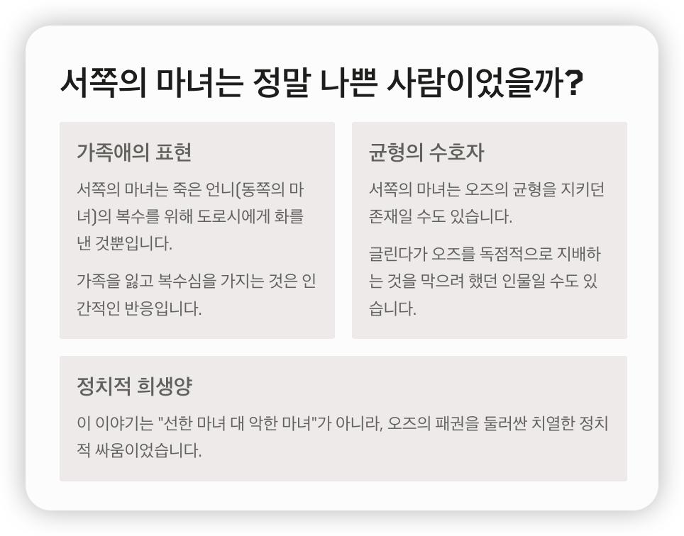 이 이야기는 "선한 마녀 대 악한 마녀"가 아니라, 오즈의 패권을 둘러싼 치열한 정치적 싸움이었던 것입니다.