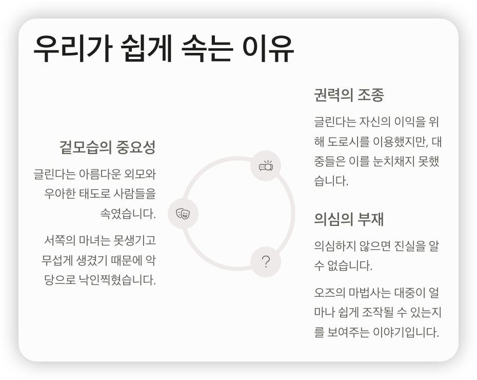- 실제로도 우리는 정치, 미디어, 사회에서 겉모습에 속아 진실을 놓치는 경우가 많습니다.