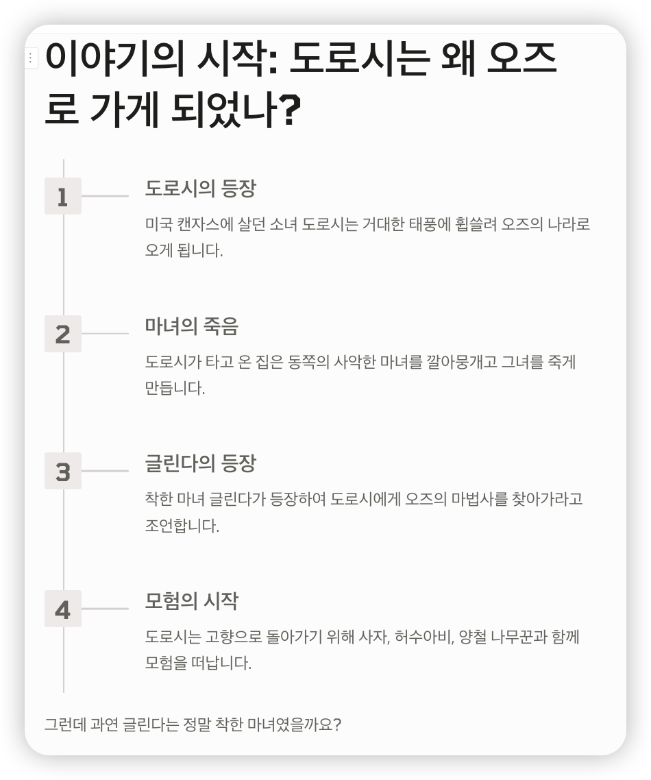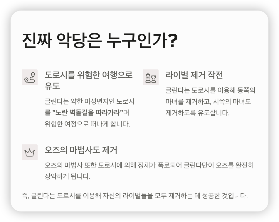 결과적으로, 오즈의 마법사는 '선악의 대결'이 아니라, 한 마녀의 치밀한 권력 장악 과정이었던 것입니다.