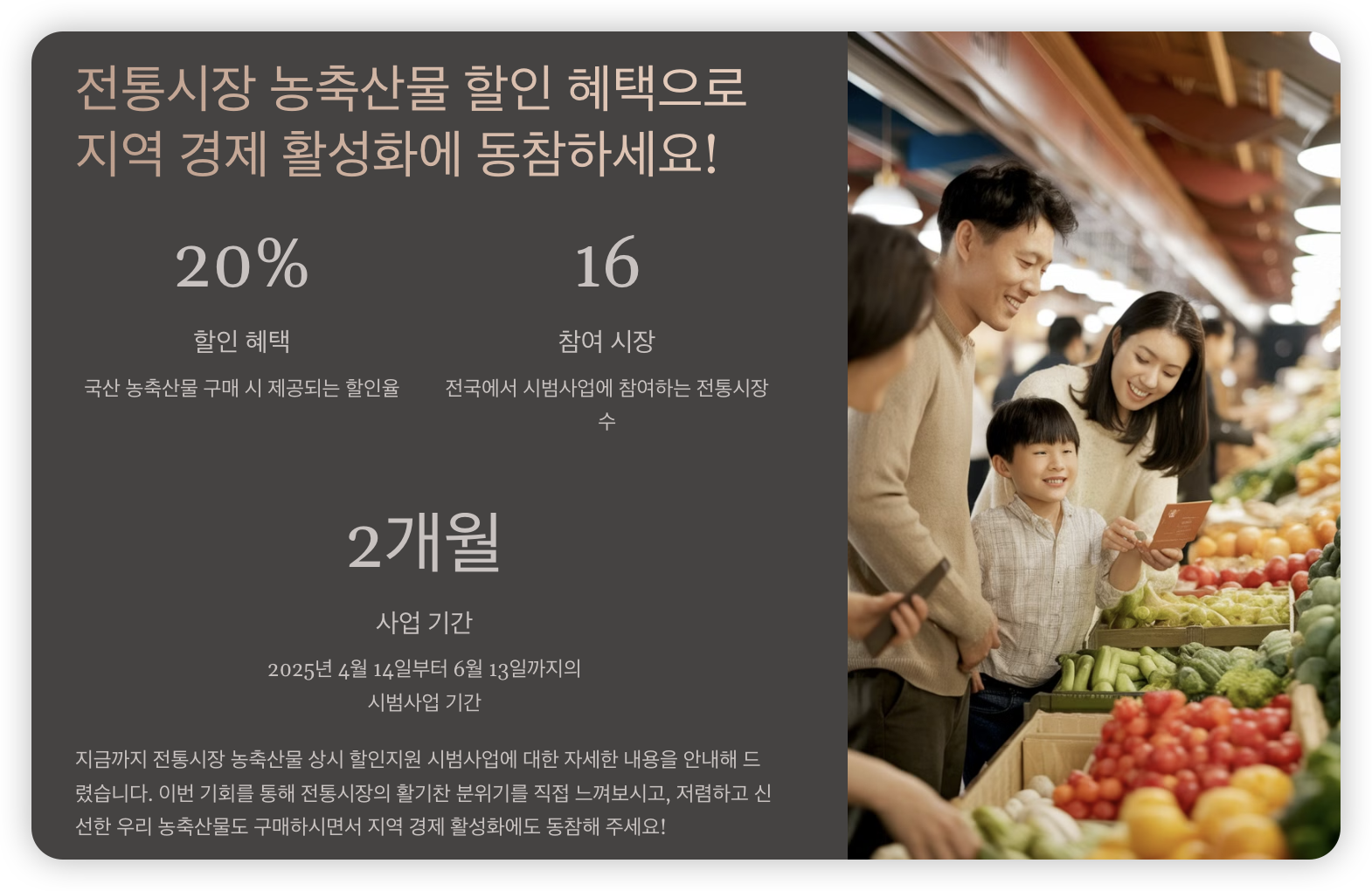 지금까지 전통시장 농축산물 상시 할인지원 시범사업에 대한 자세한 내용을 안내해 드렸습니다. 이번 기회를 통해 전통시장의 활기찬 분위기를 직접 느껴보시고, 저렴하고 신선한 우리 농축산물도 구매하시면서 지역 경제 활성화에도 동참해 주세요!