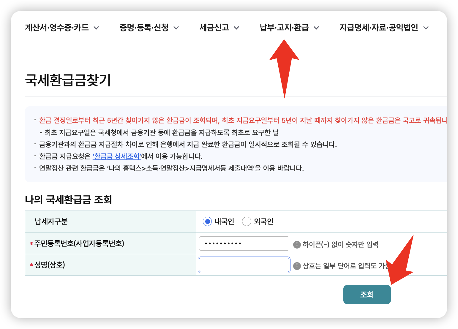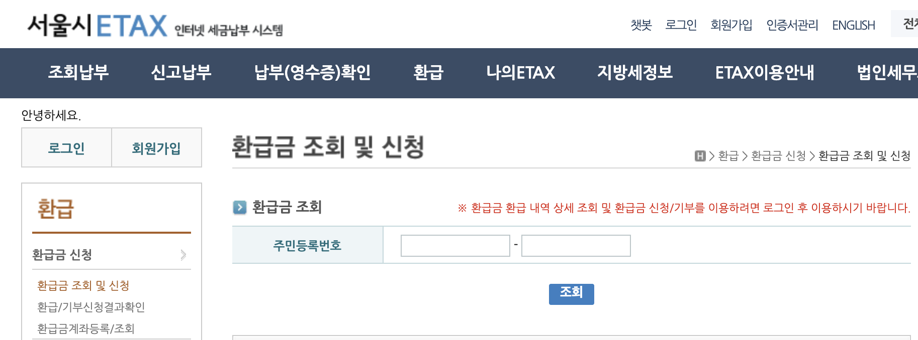 - 홈택스 접속 > 납부/고지/환급 > 환급금 조회 메뉴