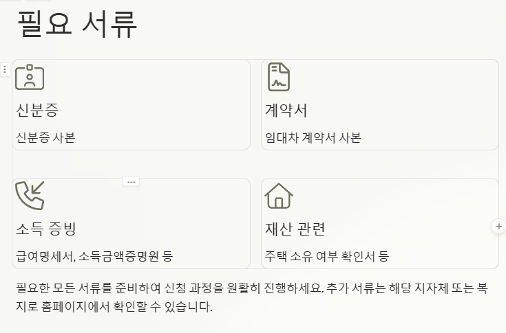 • 기타 필요한 서류 (해당 지자체 또는 복지로 홈페이지 확인)