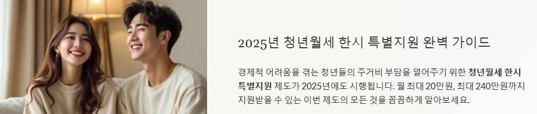 경제적 어려움을 겪는 청년들의 주거비 부담을 덜어주기 위한 청년월세 한시 특별지원 제도가 2025년에도 시행됩니다. 월 최대 20만 원, 최대 240만 원까지 지원받을 수 있는 이번 제도의 신청방법 및 자격조건 모든 것을 꼼꼼하게 알아보세요.