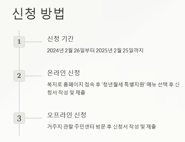 • 온라인: 복지로 홈페이지 접속 후 '청년월세 특별지원' 메뉴 선택 후 신청서 작성 및 제출