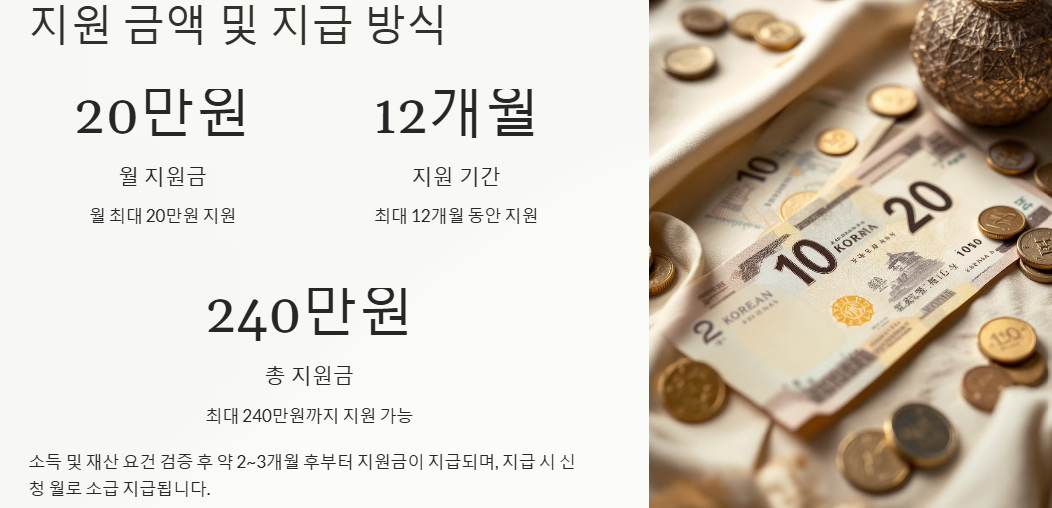 • 월 최대 20만 원 (최대 12개월 지원, 총 240만 원)