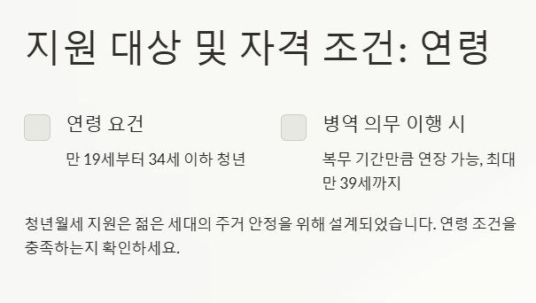 - 만 19세부터 34세 이하 청년 (병역 의무 이행 시 복무 기간만큼 연장 가능, 최대 만 39세)