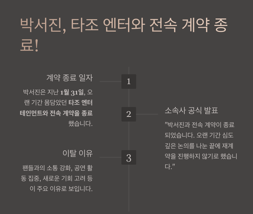 "박서진과 전속 계약이 종료되었습니다. 오랜 기간 심도 깊은 논의를 나눈 끝에 재계약을 진행하지 않기로 했습니다. 박서진의 앞날을 진심으로 응원합니다."