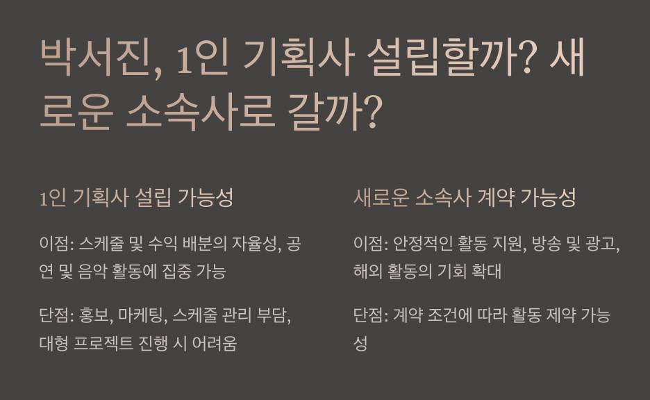 현재 박서진의 다음 행보는 아직 결정되지 않았지만, 업계에서는 크게 두 가지 가능성을 점치고 있습니다.