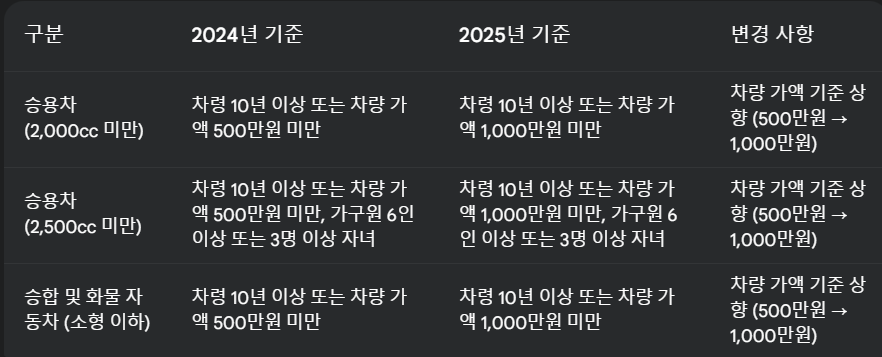 - 2024년과 2025년 자동차 재산 기준 비교표