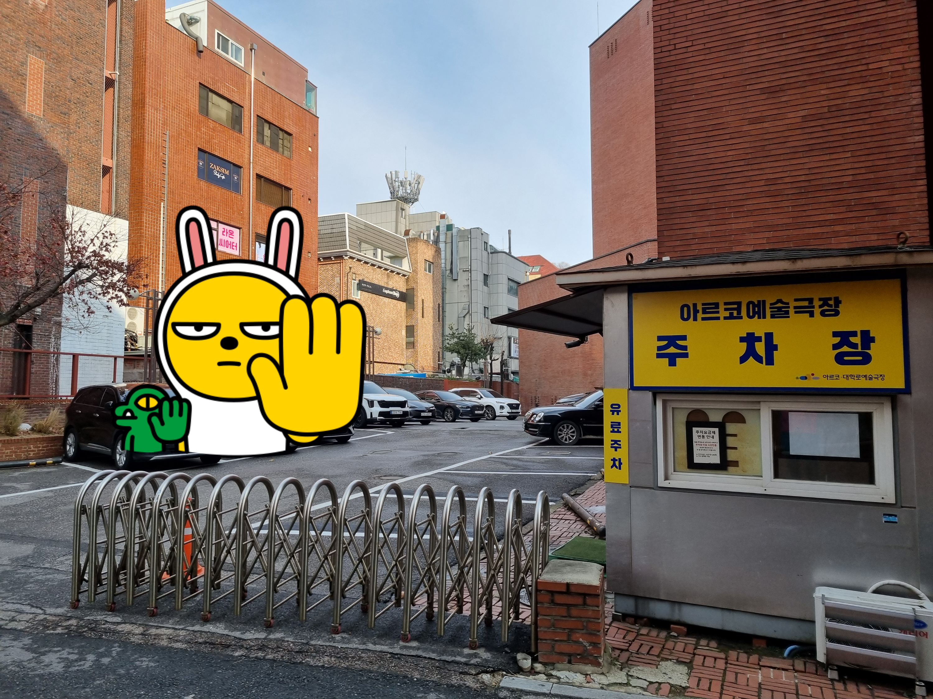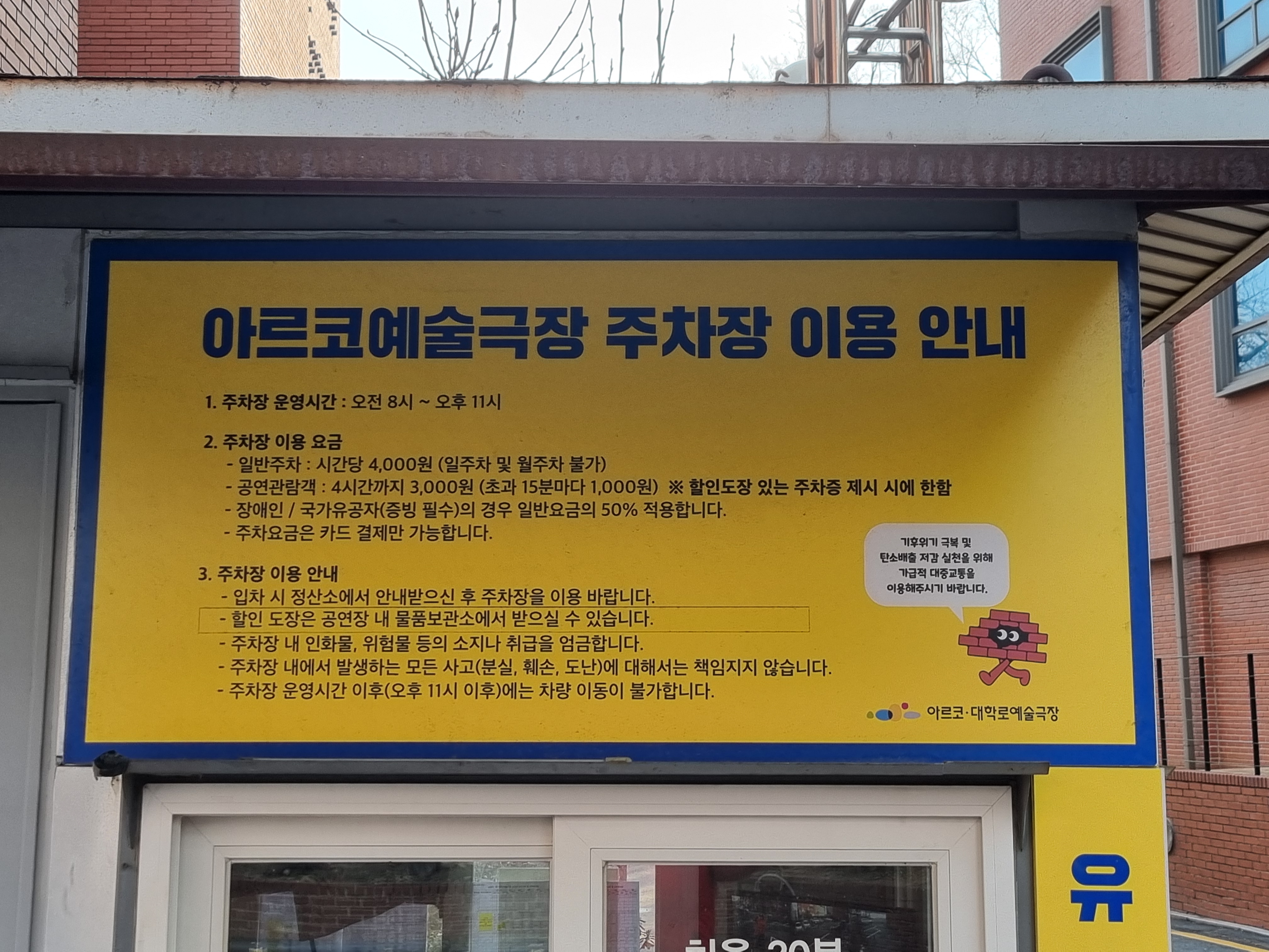 • 요금: 30분 2,000원, 이후 15분당 1,000원 (공연 관람 시 4시간까지 3,000원/ 초과 15분마다 1,000원) 할인도장 있는 주차증 제시 시에 한함
