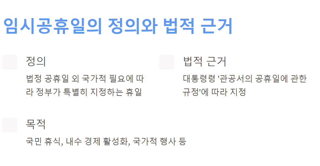 임시공휴일은 법정 공휴일 외에 국가적인 필요에 따라 정부가 특별히 지정하는 휴일입니다. 대통령령인 ‘관공서의 공휴일에 관한 규정’에 따라 지정되며, 국민들의 휴식, 내수 경제 활성화, 국가적인 행사 등을 목적으로 합니다. (관련 법령 확인)