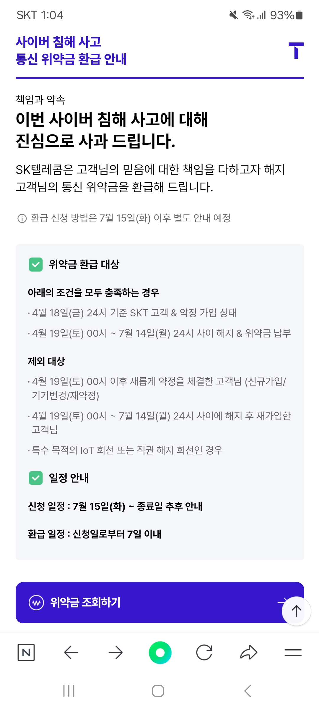 - T월드 접속하면 첫 화면에 "통신 위약금 환급 조회" 버튼 있음